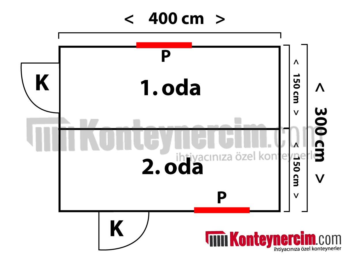 3x4m ebatında 12m2 alana sahip 2 ayrı odaya sahip fabrika, şantiye, hastane gibi yerlerde kullanıma uygun depolama ve arşivleme konteyneri.